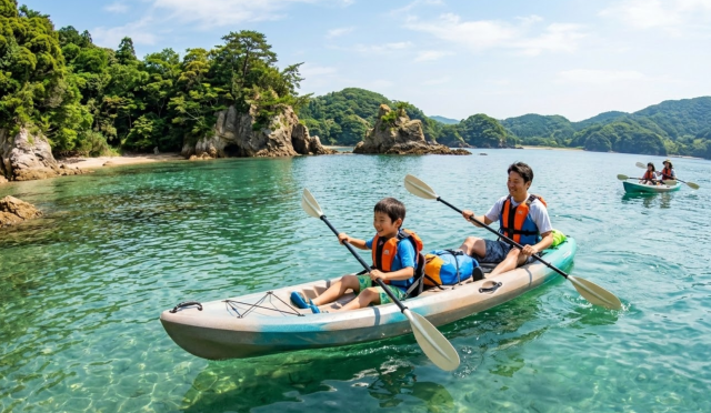 ライフジャケットを着用し、2人乗りのカヤックでパドルを合わせて水上をツーリングする。