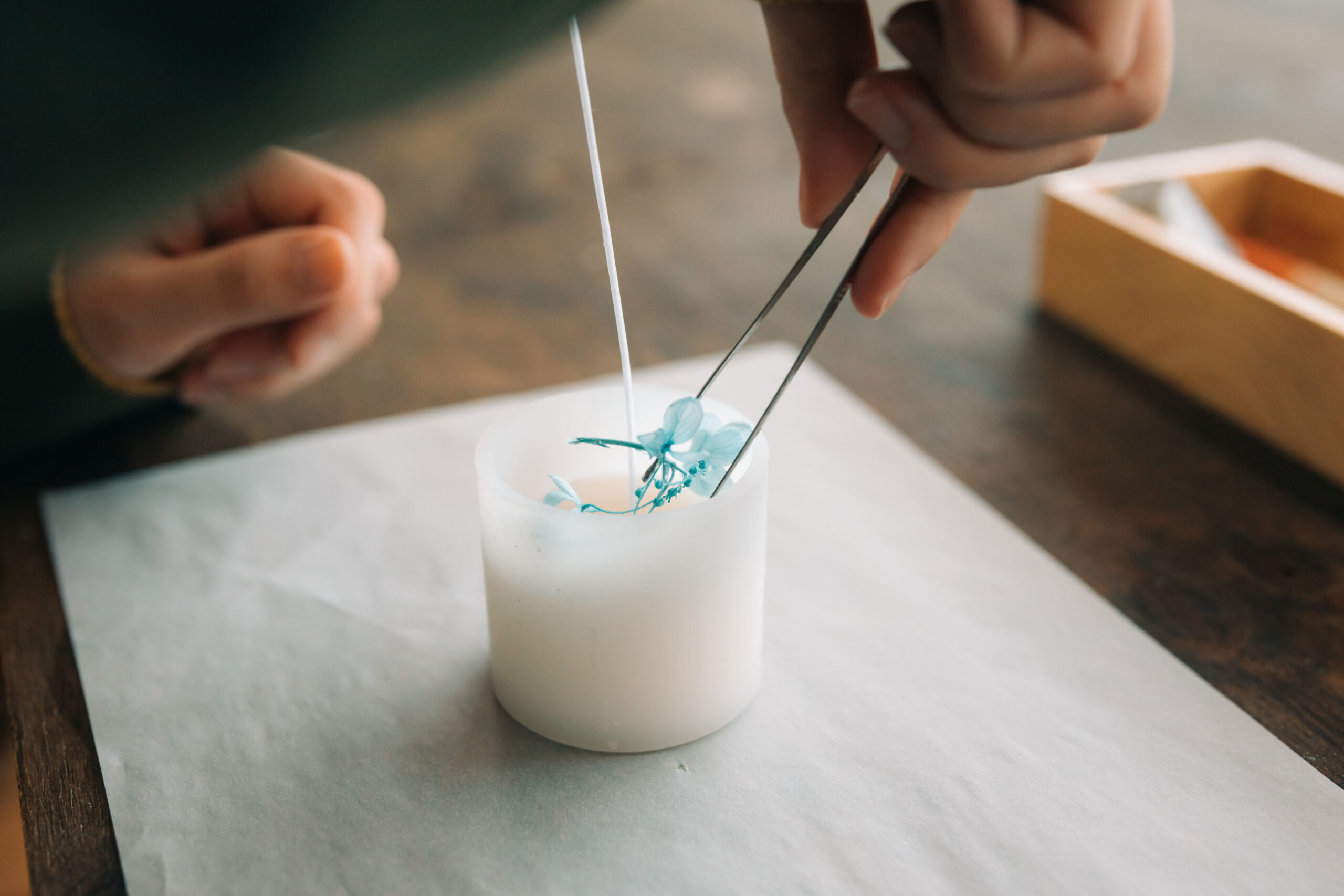 溶かしたロウにアロマオイルで香りをつけ、ドライフラワーなどを飾って固める香りのインテリア作り。