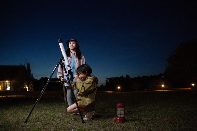 標高が高く空気の澄んだ八ヶ岳エリアで、天体望遠鏡を使って星座や月面を観察する。
