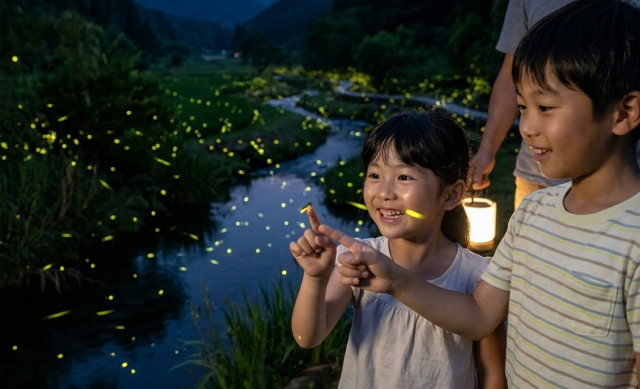 暗闇の中でフワフワ光るホタルを探す魔法のような夏の夜