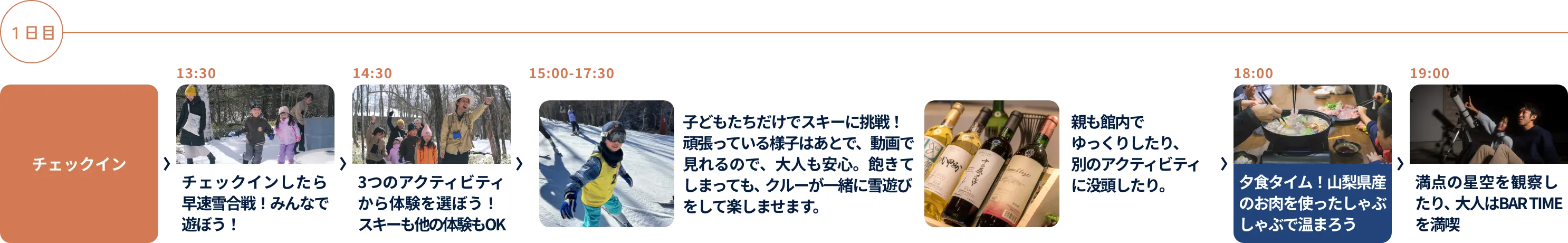 | 持ち物 | ニット帽 / ゴーグル / 手袋 / スキー板 / スキーブーツ / ウェア ※すべてレンタルとしてご用意がございます。 ※その日の天候によりますが、スキーウェアの中は重ね着されることをおすすめしております。 |