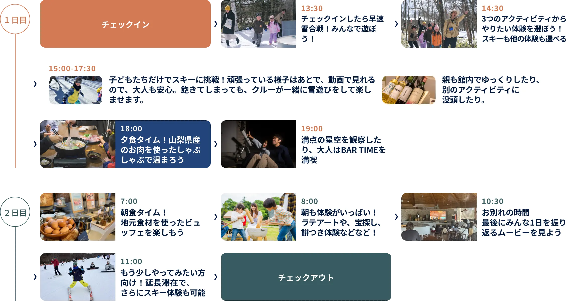 スキーも雪あそびもクラフトも、星空観察も。毎日20種以上のアクティビティが、追加料金・予約不要で楽しめる泊まれるテーマパーク。スキー用品レンタルも無料で手ぶらOK!地元食材の食事とともに、冬の八ヶ岳をまるごと体験。